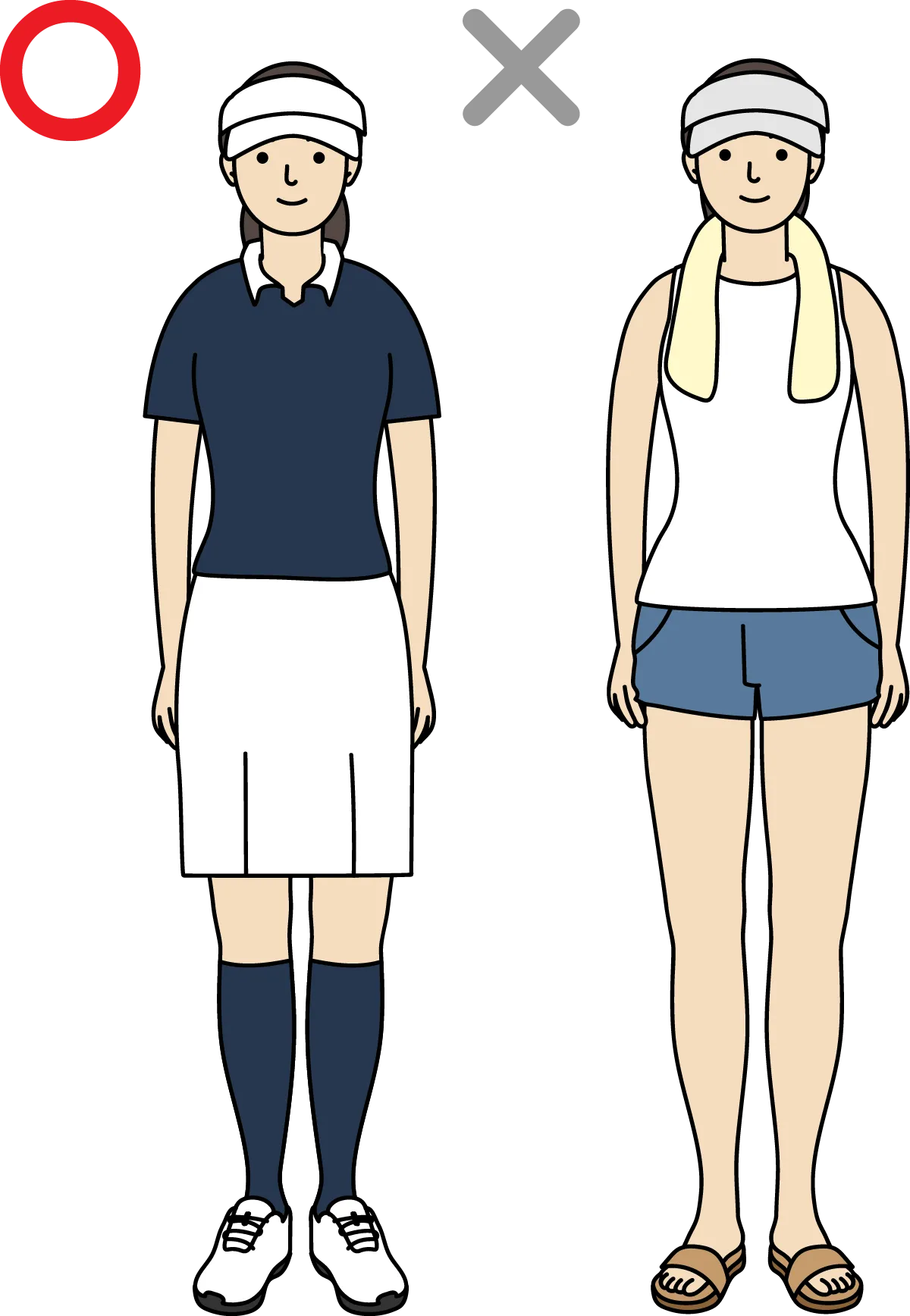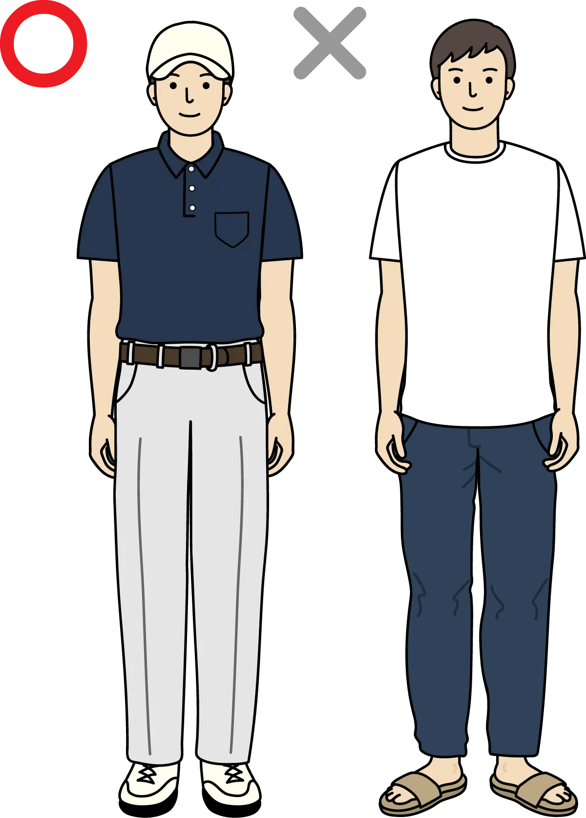 ・ポロシャツ・ゴルフ用シャツ等襟付シャツの着用をお願いします。(但し、女性のオーバーブラウス仕立てのシャツはこの限りではありませんが、腹部が見える着丈の短いものはご遠慮願います。)
