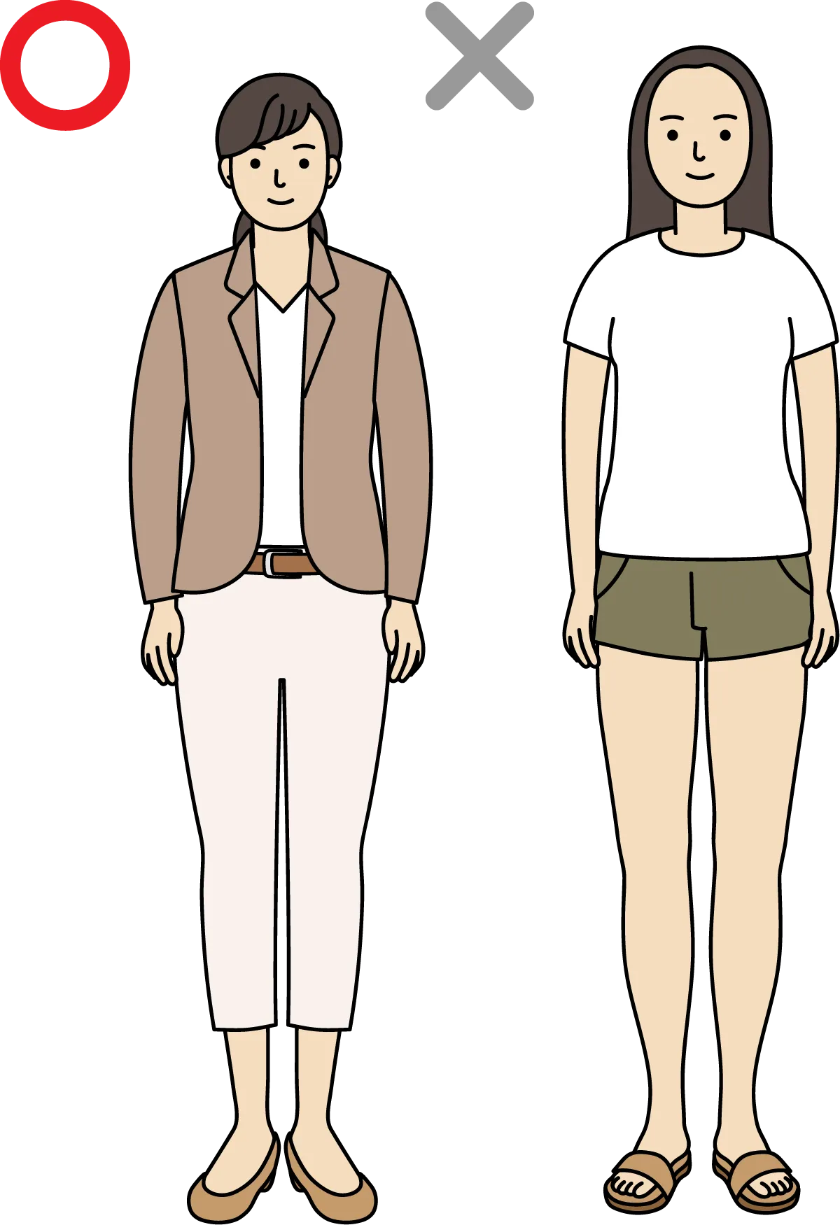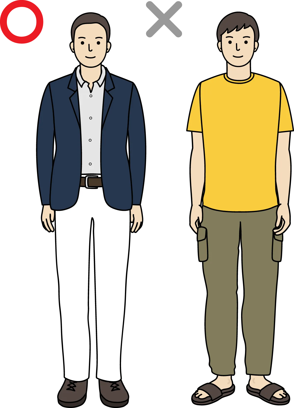 ・ジーンズや作業着、ラフなズボン、半ズボン等でのご来場はお断りします。